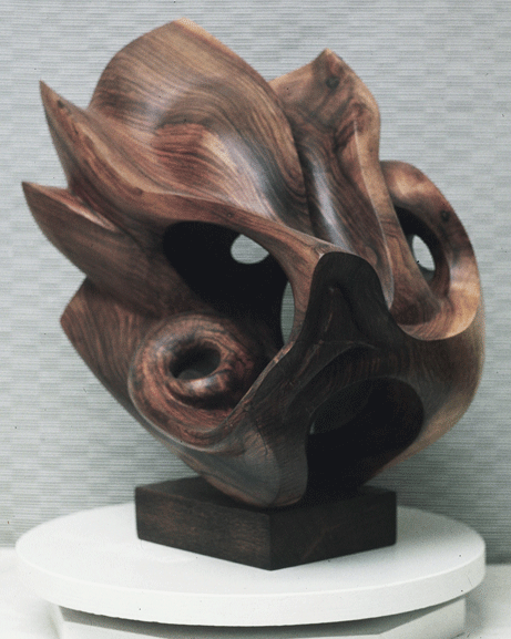 “A mollusc presents itself to human perception as two entities: an architectural structure of mathematical subtlety and a living form that is protean, visceral and sensuous. Made from a log containing the juncture of trunk and branches and so needing much hollowing if it were not to split in the process of seasoning, my sculpture aims to combine these two characteristics in one shape.” Hugo Powell
